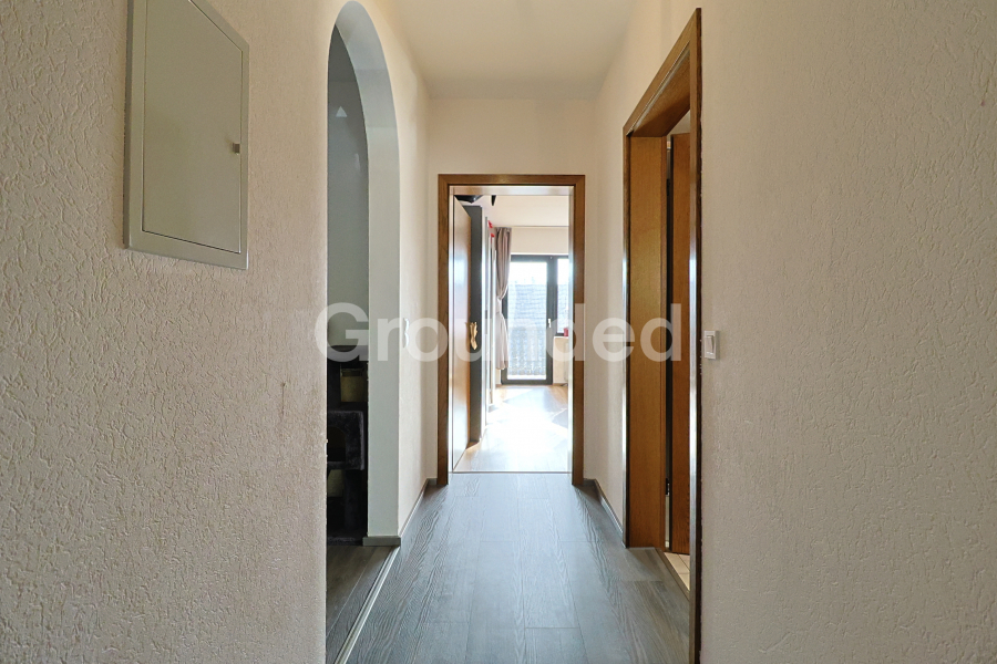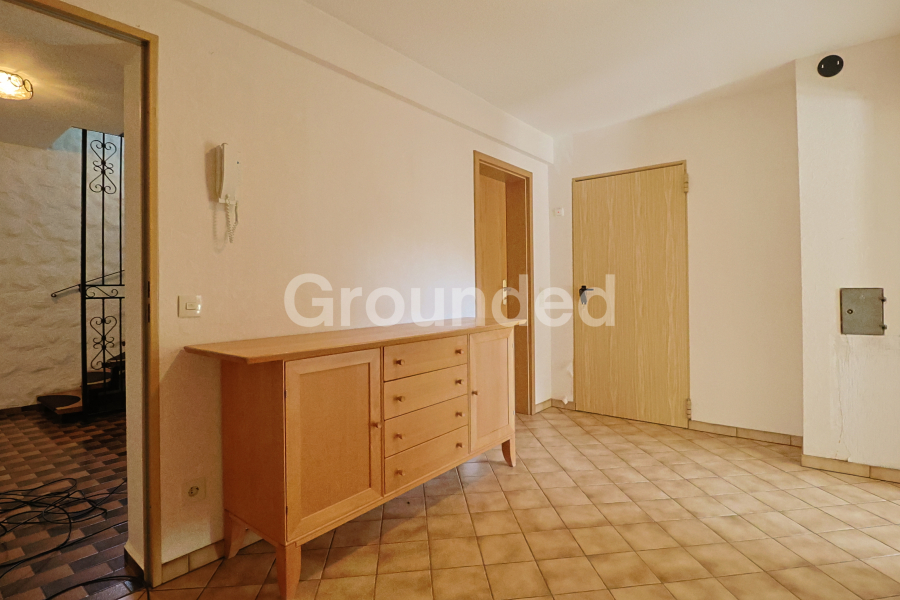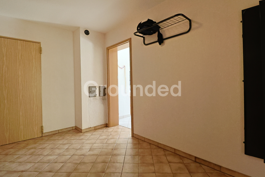 Nach der Haustüre finden Sie das Treppenhaus, von wo Sie in den zentralen Eingangsbereich im Erdgeschoss gelangen. Von dort erreichen Sie das Esszimmer mit angrenzender Küche und Speisekammer, das Gäste-WC, das Wohnzimmer mit großzügigem Balkon, das Schlafzimmer – ebenfalls mit Zugang zum Balkon – das Kinderzimmer und ein voll ausgestattetes Badezimmer mit Badewanne, Dusche und WC.
