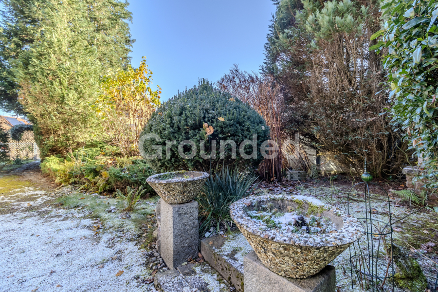 Das Objekt verfügt zudem über eine Garage und einen Garten mit einer kleinen Gartenlaube und überdachtem Außensitz.