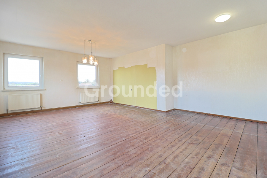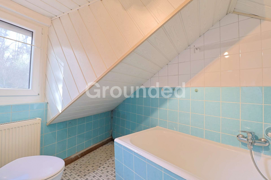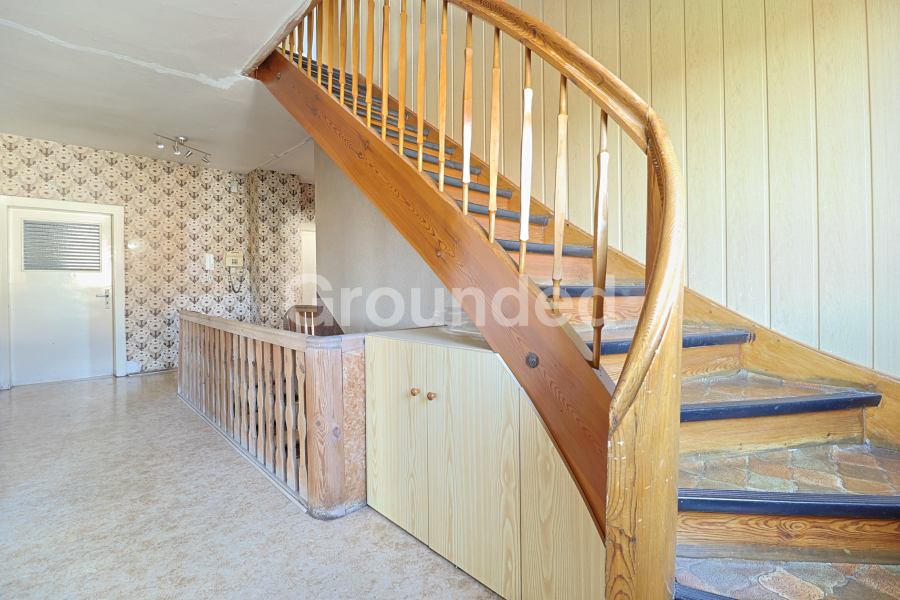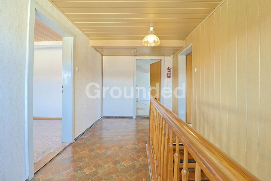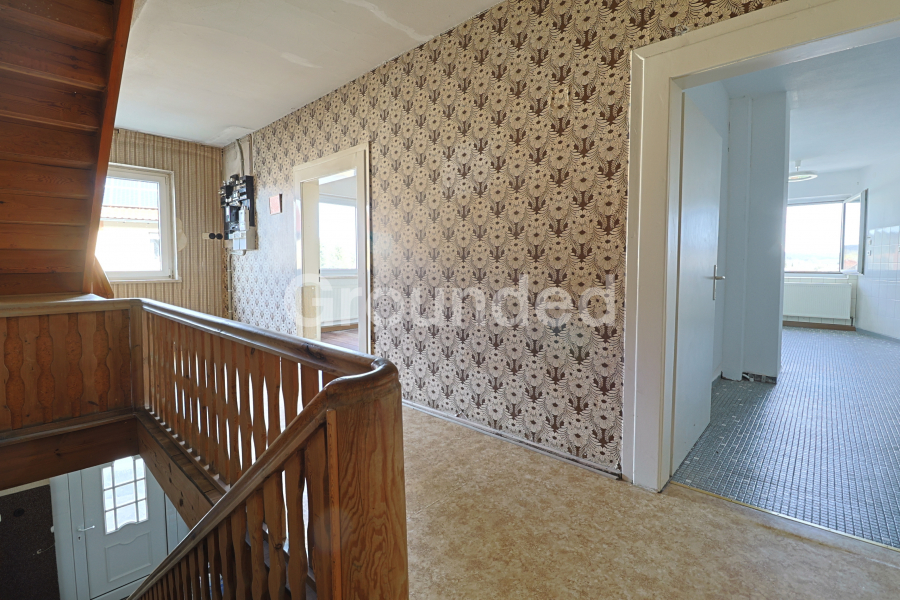 Im ersten Obergeschoss gelangen Sie rechts ins Schlafzimmer, ins Badezimmer mit Badewanne und einem kleinem Wohnzimmer mit Durchgang zu Terrasse und Garten. Des Weiteren finden Sie einen Durchgang zum Dachboden über den Hallen, die Küche und das große Wohnzimmer.