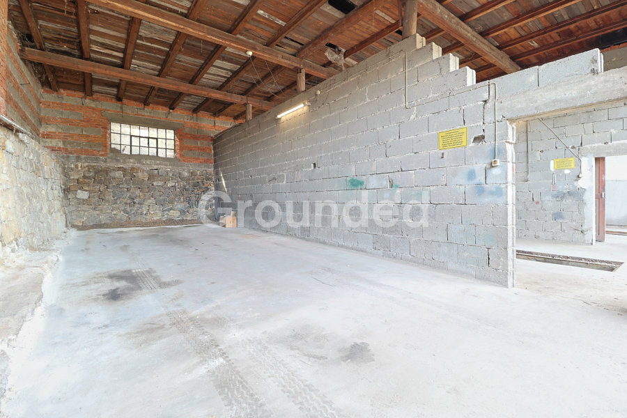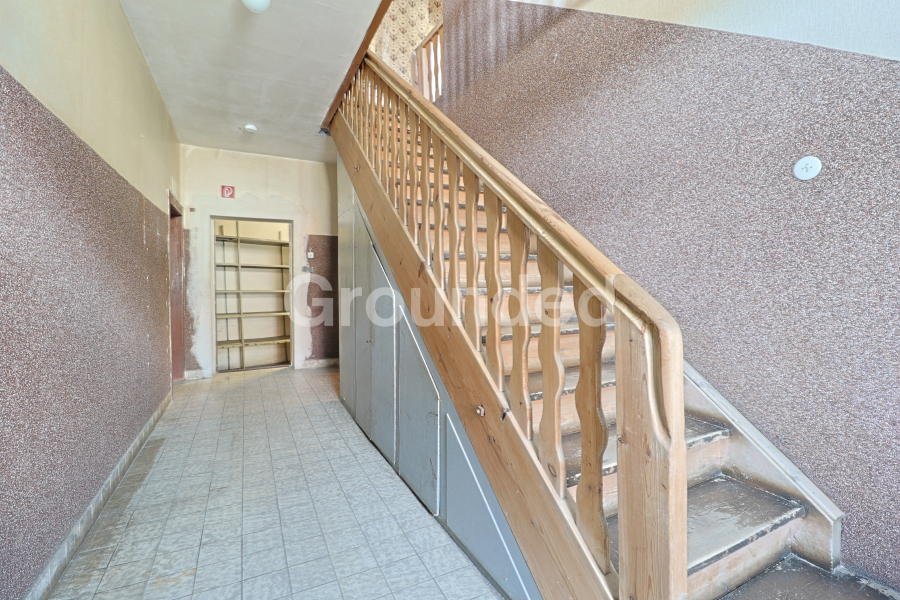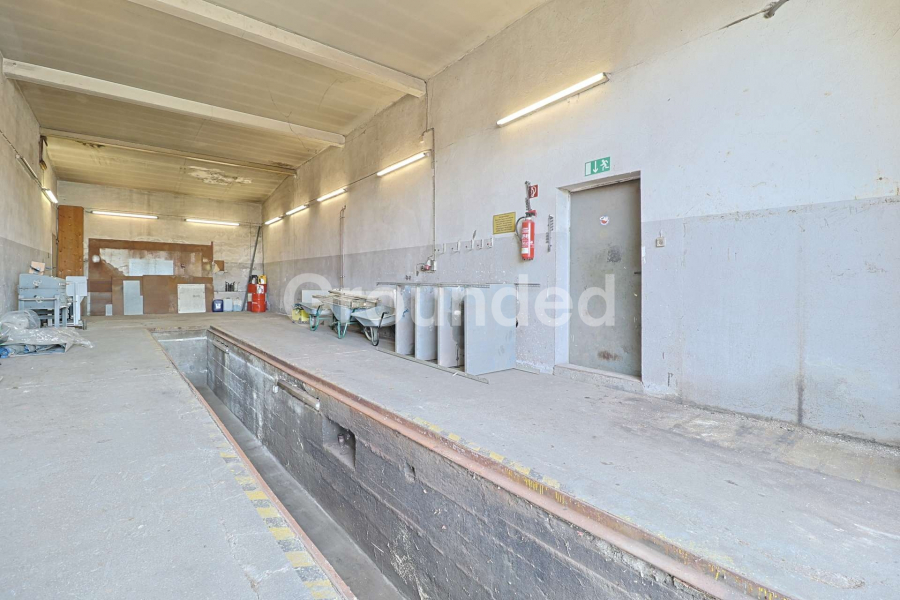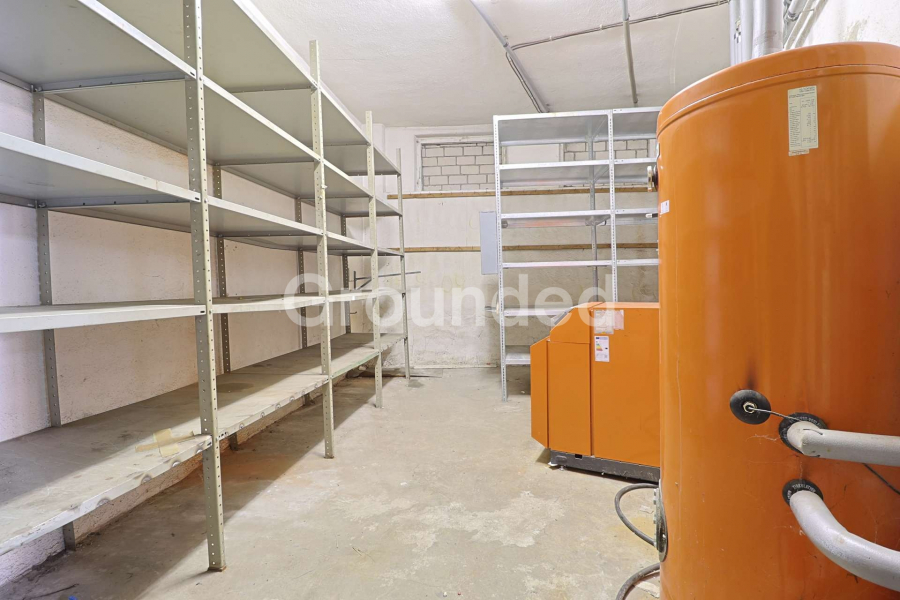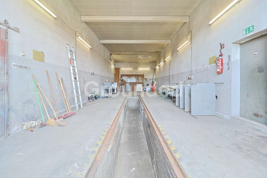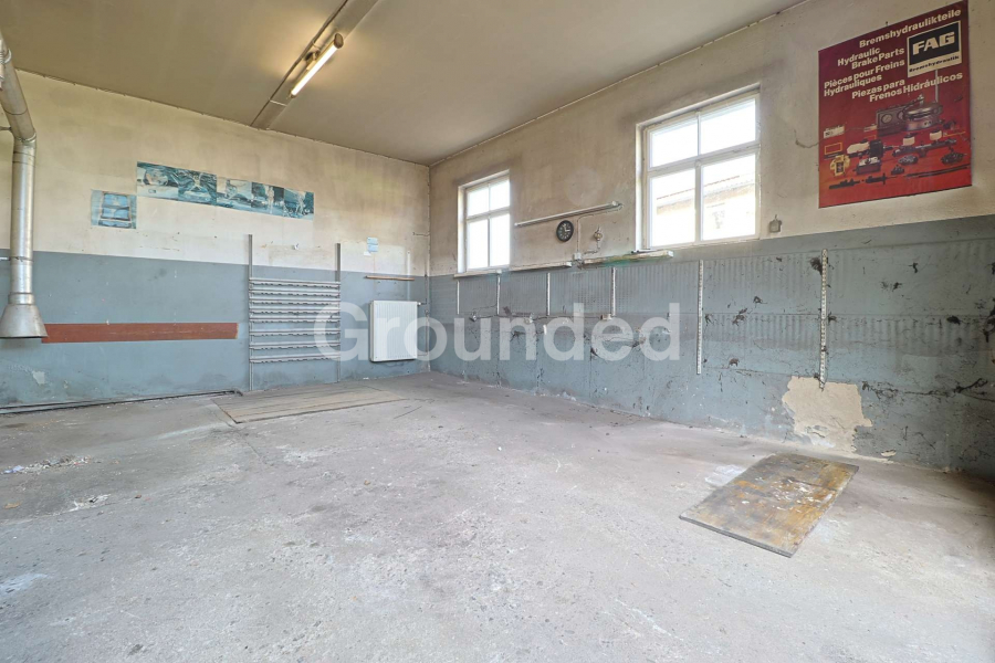 Von der Eingangstüre aus erreichen Sie rechts einen als Büro genutzten Raum, weiter hinten im Flur den Kellerraum, den Lager- und Heizungsraum und den Durchgang zur Werkstatt und den drei Großraumgaragen.