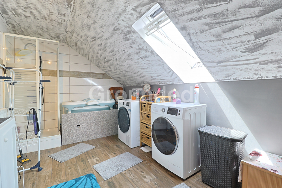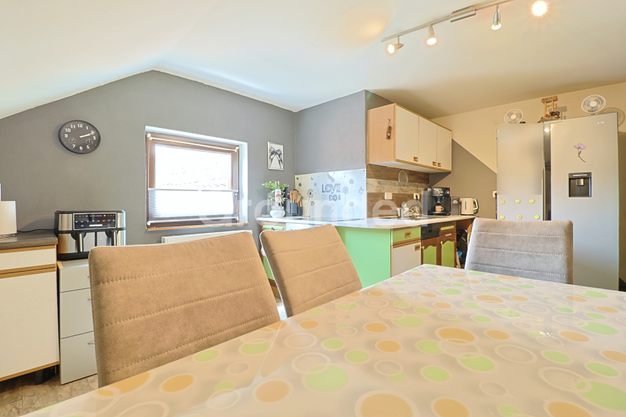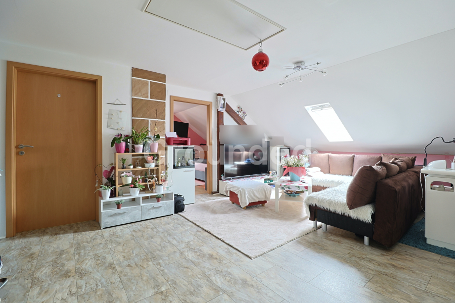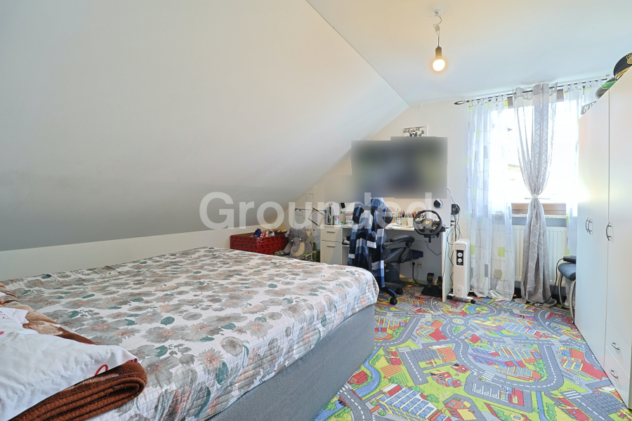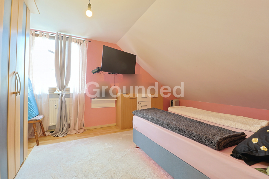 Im Dachgeschoss befindet sich die dritte, vermietete Wohneinheit, die aus einem Wohnzimmer, zwei Schlafzimmern, einer Küche und einem Badezimmer mit Dusche besteht.