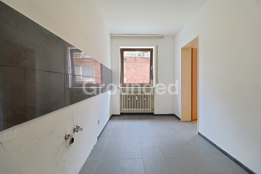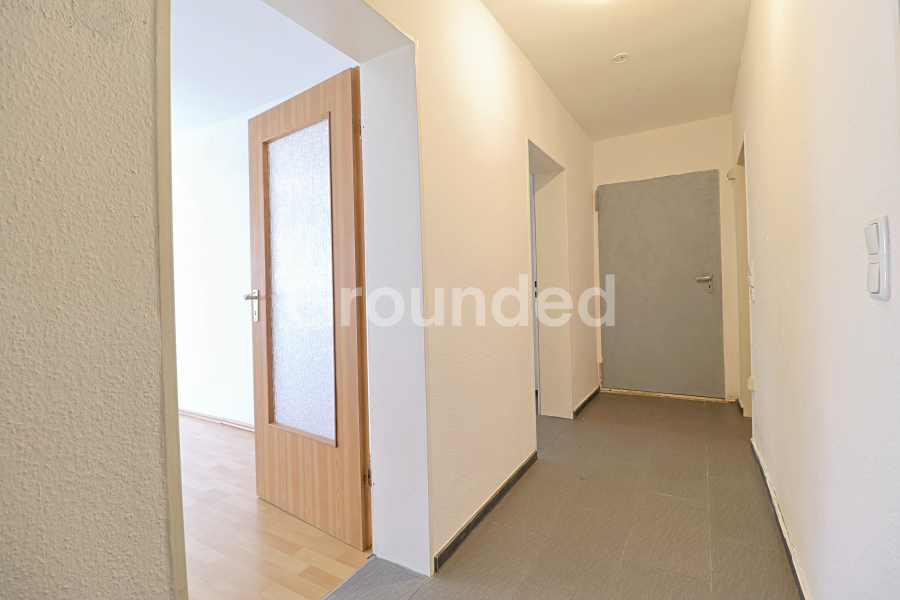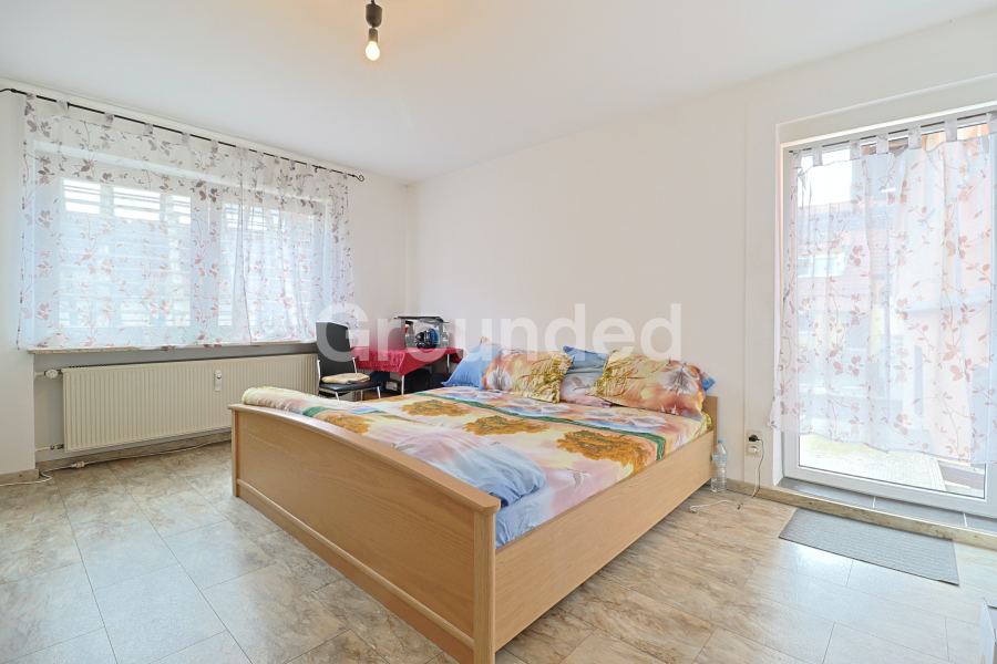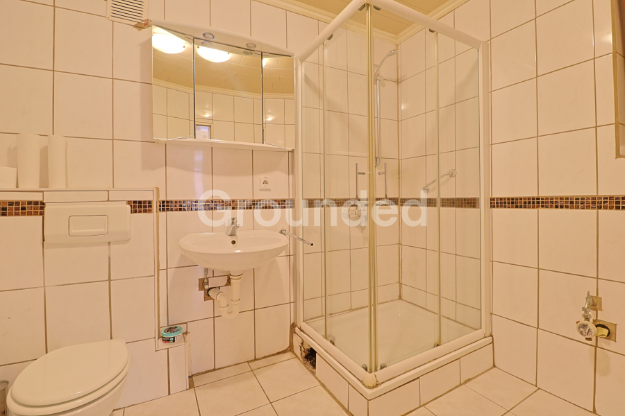 Im Erdgeschoss befindet sich links vom Gebäudeeingang eine vermietete Wohnung sowie der Zugang zum Öl-Tank. Den Heizraum erreichen Sie zusätzlich durch einen Zugang hinter dem Haus. Die Wohnung im EG bietet ein Badezimmer mit Dusche, ein Schlafzimmer, eine Küche ohne Einbauküche und ein Wohnzimmer.