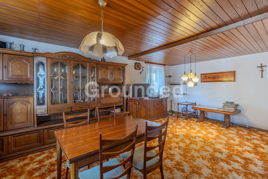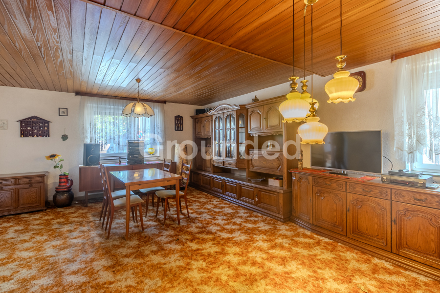 Vom Eingangsbereich im Erdgeschoss gelangt man linker Hand in das Wohnzimmer sowie in die Küche, die mit einer älteren Einbauküche ausgestattet ist.