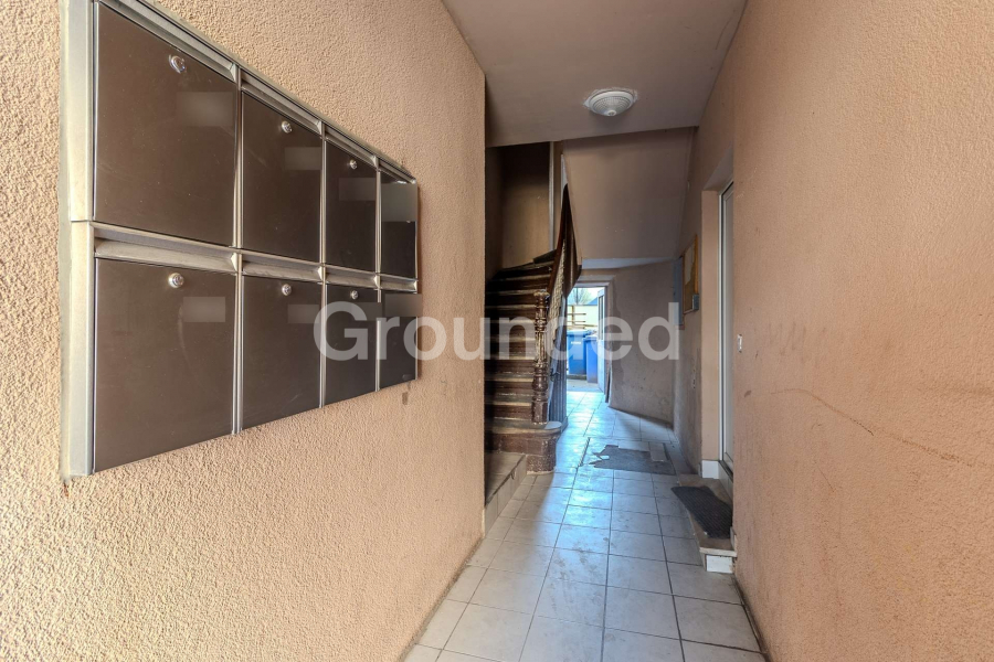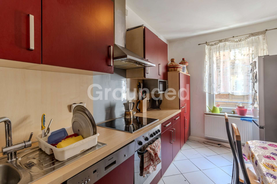 Folgt man dem Flur, führt dieser in einem leichten Winkel weiter und öffnet sich zu einem praktischen Bereich mit weiteren Wohnfunktionen. Hier befindet sich das gepflegte Badezimmer, das mit einer Badewanne, einer separaten Dusche sowie einem Waschmaschinenanschluss ausgestattet ist – ein echtes Plus in Sachen Komfort. Auf der gegenüberliegenden Seite liegen das gemütliche Kinder- oder Arbeitszimmer sowie die separate Küche, die ausreichend Platz für einen kleinen Essbereich bietet.