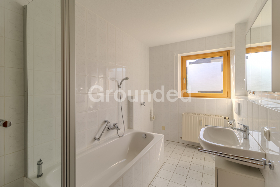 Geradeaus vom Flur aus befinden sich das Badezimmer mit Dusche, Badewanne und Waschmaschinenanschluss sowie die Küche mit einer Einbauküche. Auf der rechten Seite des Flurs liegt das ruhig gelegene Schlafzimmer.